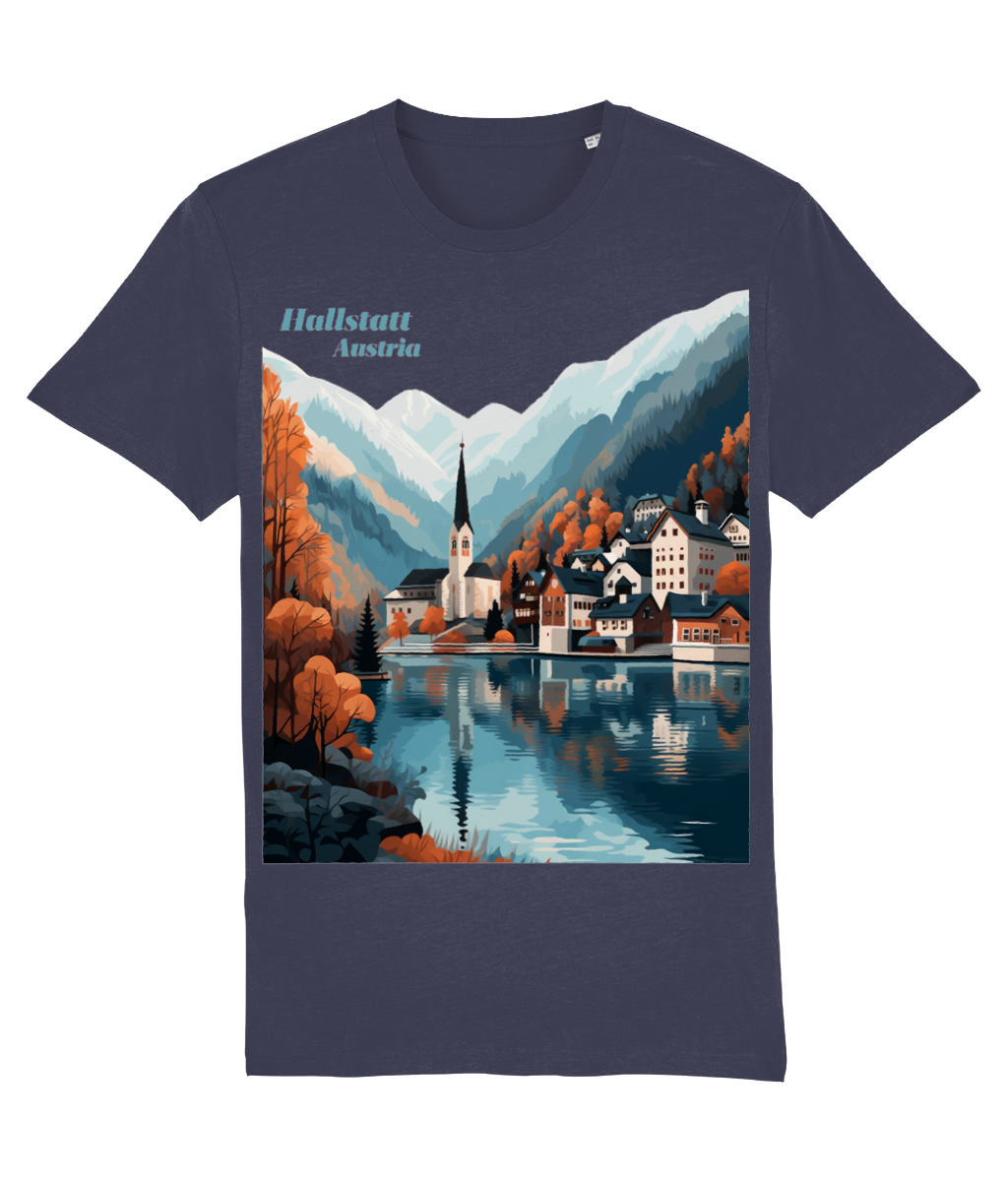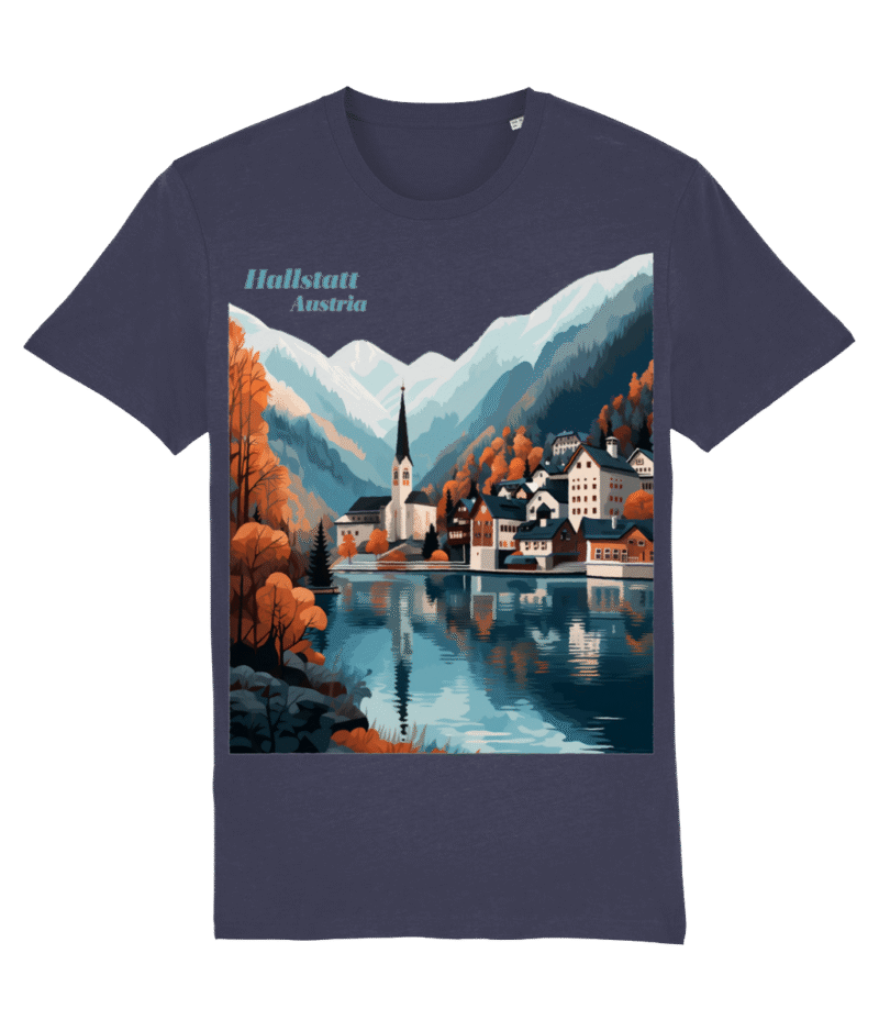 A peaceful lakeside scene from Hallstatt, Austria — where alpine peaks rise above charming village rooftops reflected in still waters. With crisp lines and warm autumn tones, this design captures the beauty of one of Europe’s most photographed villages. Explore in style with our 100% Organic Ring-Spun Combed Cotton Hallstatt t-shirt.