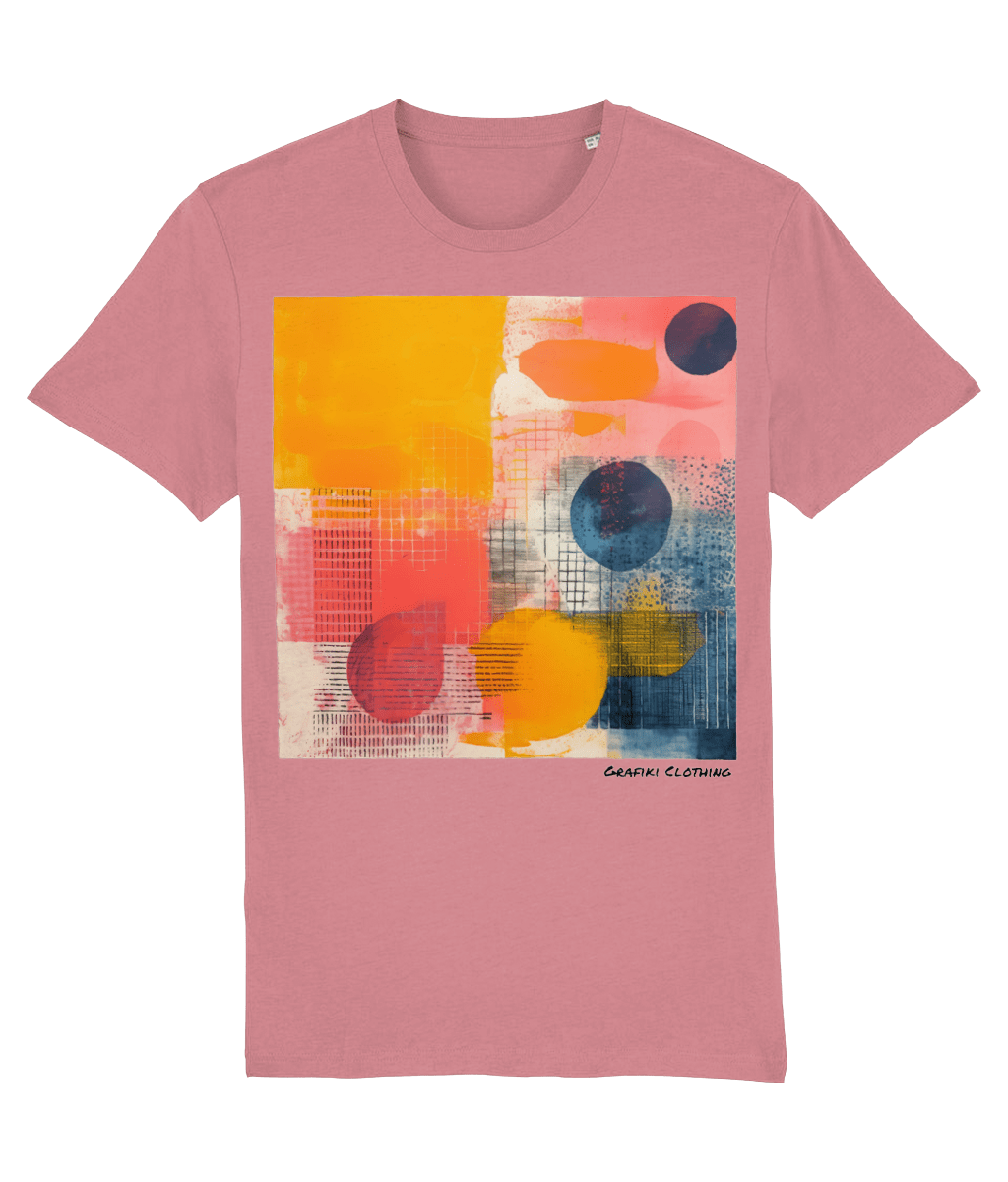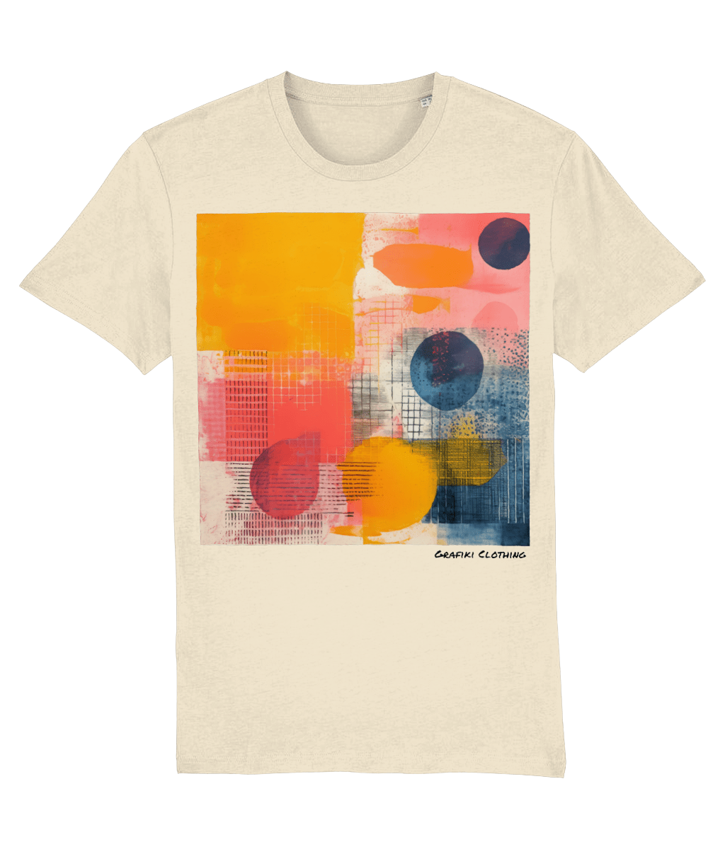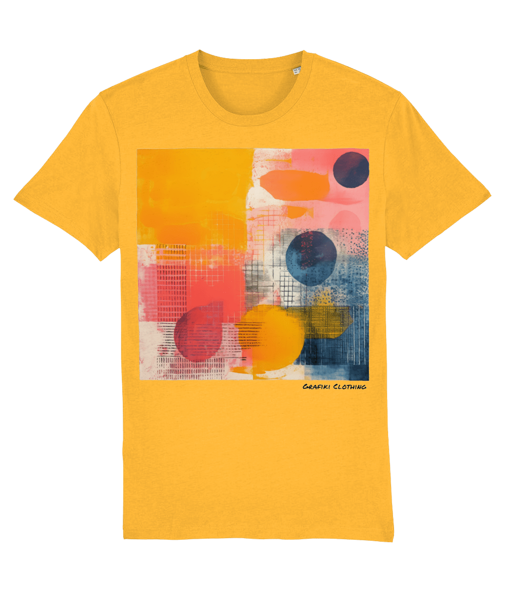 A bold fusion of colour and texture — a vibrant play of warm oranges, yellows, and pinks with deep indigo and geometric grids, creating a striking abstract composition. A design that feels both playful and architectural, capturing movement on a static canvas. Step into the abstract with our 100% Organic Ring-Spun Combed Cotton Paper Print t-shirt.